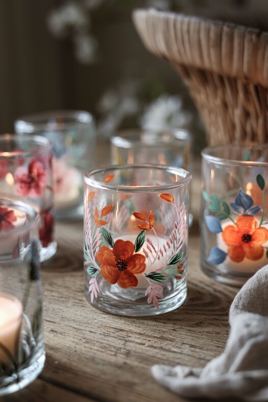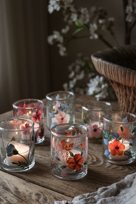 Handmålade blommor i livfulla färger ger denna värmeljushållare en unik och levande karaktär. Varje exemplar är ett litet hantverk som sprider värme och stämning – lika vacker på egen hand som en färgstark och personlig detalj i ditt hem. | Från IB Laursen