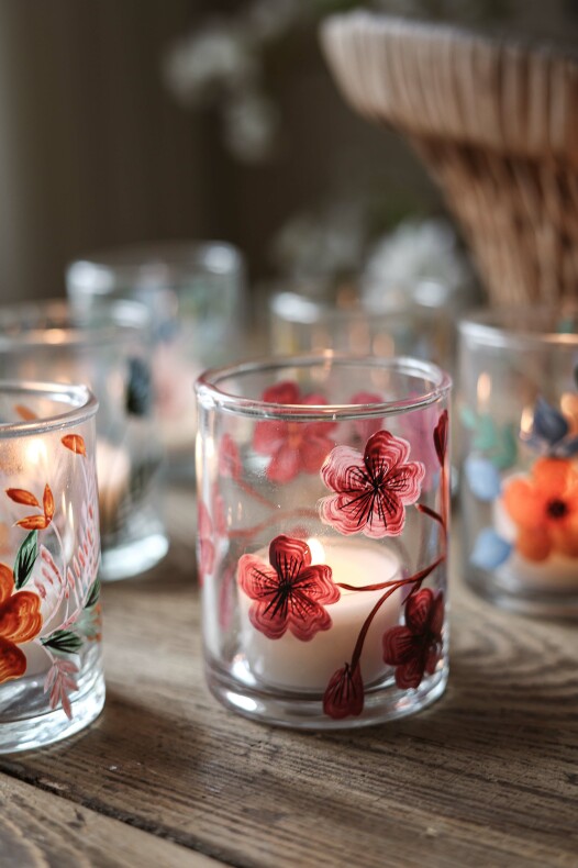 Handmålade blommor i livfulla färger ger denna värmeljushållare en unik och levande karaktär. Varje exemplar är ett litet hantverk som sprider värme och stämning – lika vacker på egen hand som en färgstark och personlig detalj i ditt hem. | Från IB Laursen