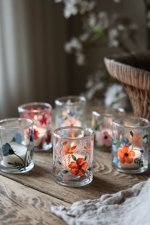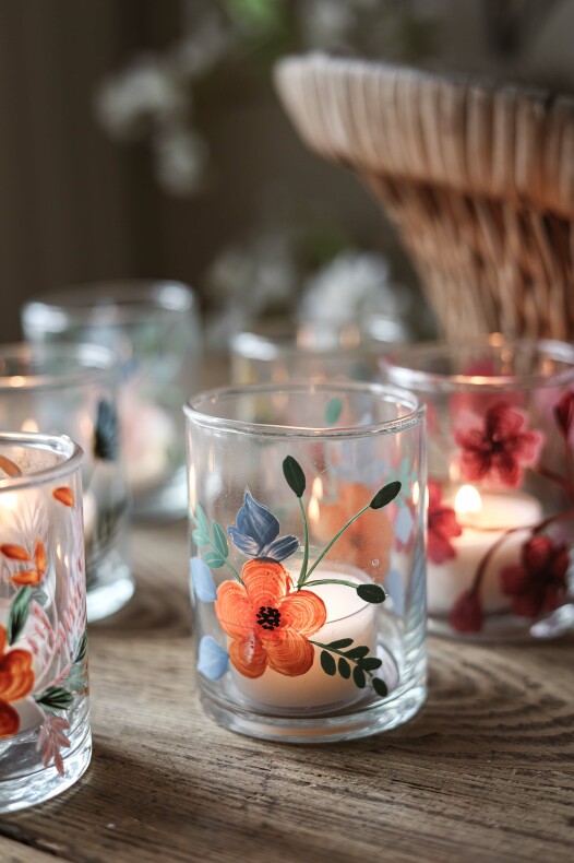 Handmålade blommor i livfulla färger ger denna värmeljushållare en unik och levande karaktär. Varje exemplar är ett litet hantverk som sprider värme och stämning – lika vacker på egen hand som en färgstark och personlig detalj i ditt hem. | Från IB Laursen