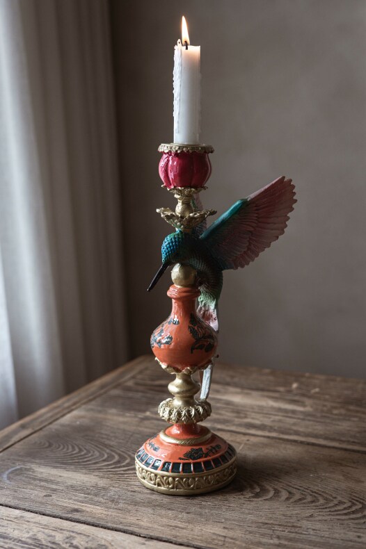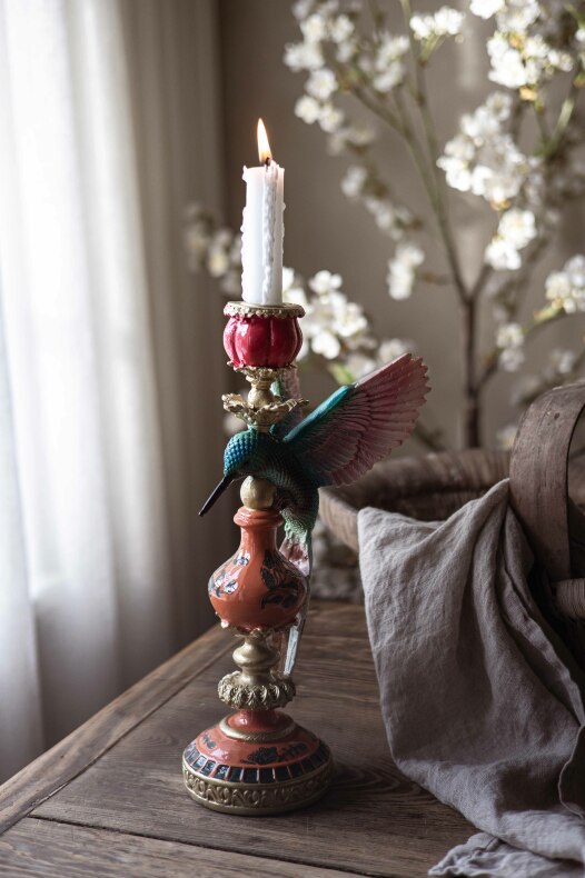Inred med levande ljus med en härlig ljusstake med en kolibri | Från A Lot Decoration