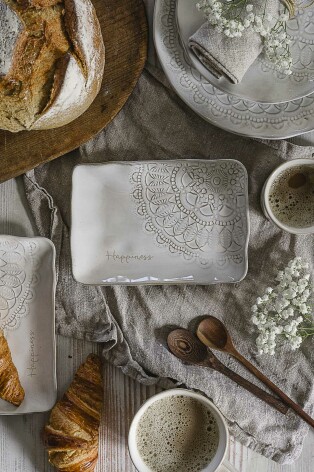 Vår handgjorda stengods serie med präglat mönster i vacker levande finish.