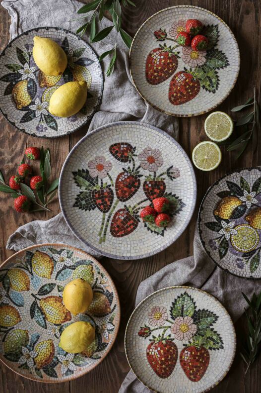 Hållbart stengods med vackert mosaikmönster av jordgubbar.