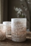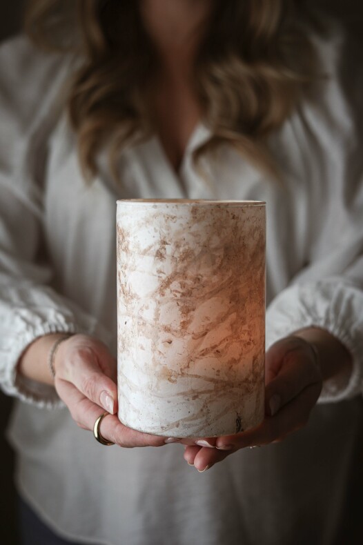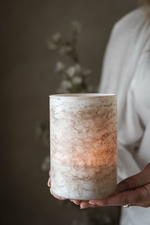 Finish Handgjord glaslykta i vacker vit/sand/grå finish med levande mönstring