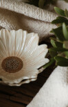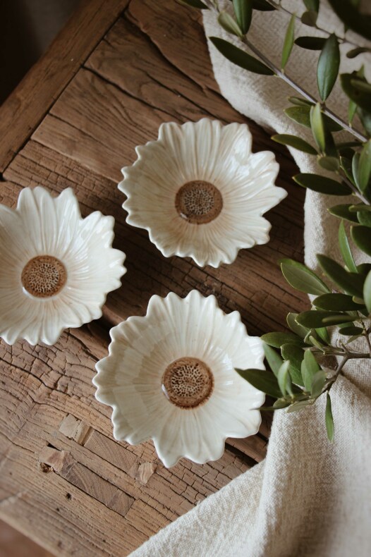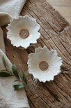 Ljuvlig skål i formation av en blomma med handmålat mönster i taupe och brunt.