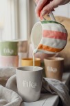 Härlig mjölkkannan med organisk levande känsla i keramiken, handmålade ränder runt om i glada färger