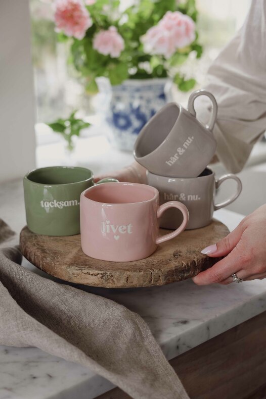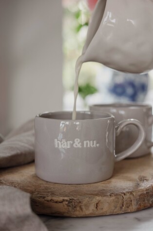 Ljuvlig mugg med organisk handgjord känsla och silkscreen text i keramiken.