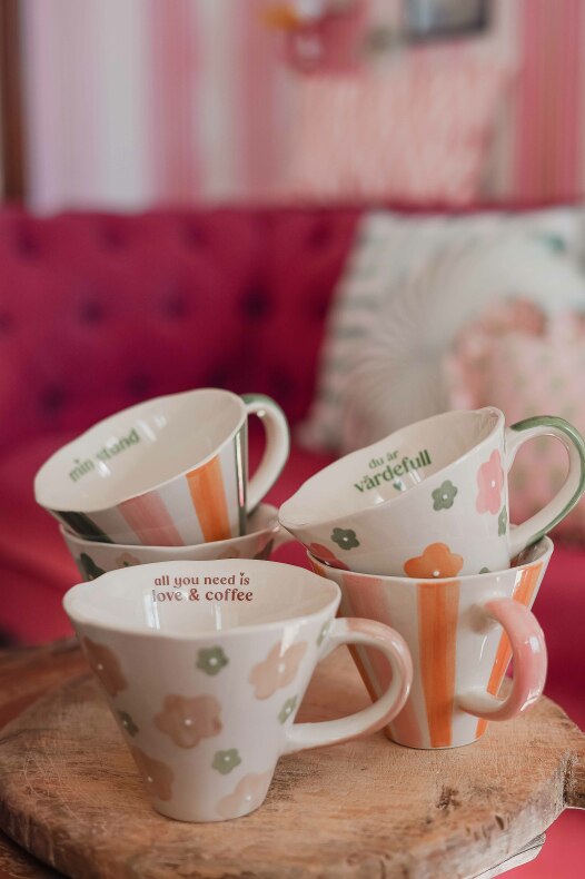 Ljuvlig mugg med handmålat mönster i glada härliga färger