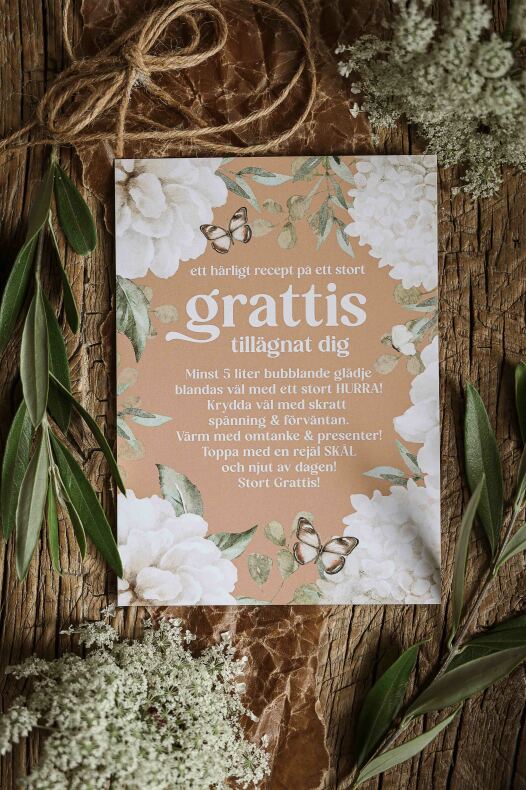 Text: Ett härligt recept på ett stort grattis tillägnat dig Minst 5 liter bubblande glädje blandas väl med ett stort HURRA! Krydda väl med skratt spänning & förväntan. Värm med omtanke & presenter! Toppa med en rejäl SKÅL och njut av dagen! Stort Grattis!
