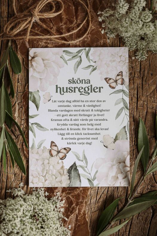 Text: Sköna husregler. Låt varje dag alltid ha en stor dos av omtanke, värme & vänlighet! Blanda vardagen med skratt & tokigheter - ett gott skratt förlänger ju livet! Kramas ofta & sätt värde på varandra. Krydda vardag som helg med nyfikenhet & firande, för livet ska levas! Lägg till en klick tacksamhet & strössla generöst med kärlek varje dag!