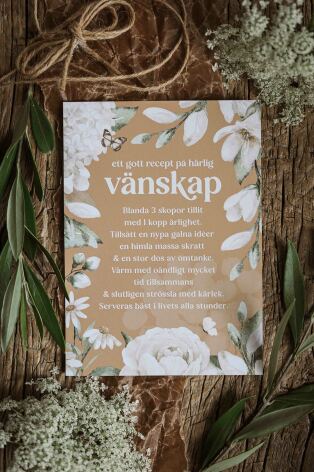 Text: Ett gott recept på härlig vänskap. Blanda 3 skopor tillit med 1 kopp ärlighet. Tillsätt en ny galna idéer en himla massa skratt & en stor dos av omtanke. Värm med oändligt mycket tid tillsammans & slutligen strössla med kärlek. Serveras bäst i livets alla stunder.